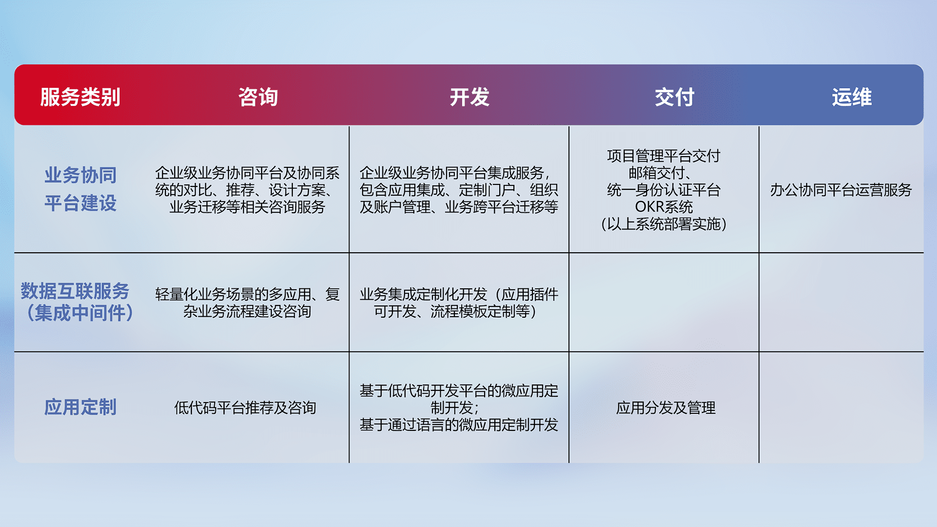 针对钉钉、、、企微、、IDaas等平台级产品提供产品的规划、、方案、、交付、、、定制化开发等服务,,实现如统一协同办公、、智能客户服务、、混合会议管理、、智能数据查询、、等业务场景,,,实现数字化转型。。。。